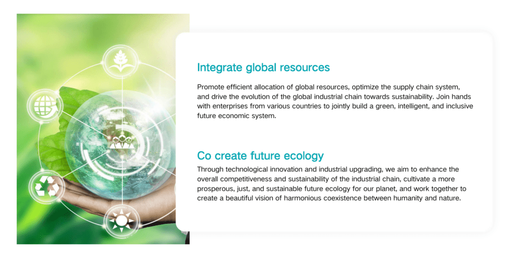 To pioneer a sustainable and innovative future by driving green transformation, fostering technological advancements, and promoting global economic integration. We aim to build a smarter, low-carbon world where industries, communities, and nature coexist harmoniously, setting new benchmarks for sustainability and economic progress.